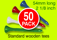 54mm Length Only £2.34 per pack of 50 plain golf tees 2 1/8" (54mm) Choice of colours Qty pack